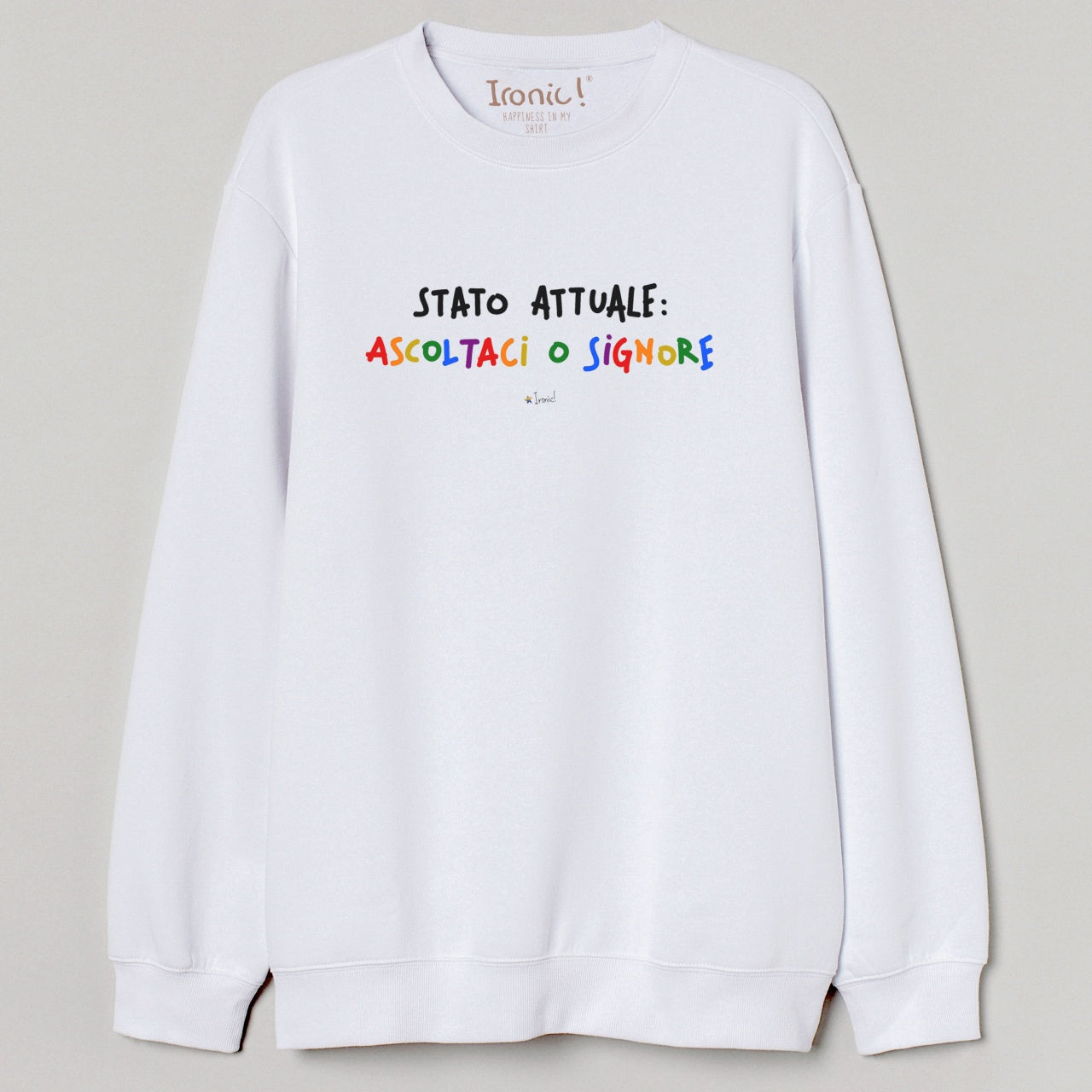 Felpa sgarzata internamente Modello girocollo manica lunga 80% cotone - 20% poliestere stampata e confezionata in Italia Lavare in lavatrice a basse temperature (massimo 30ºC) e stirare al rovescio in modo da non alterare la stampa. Salva